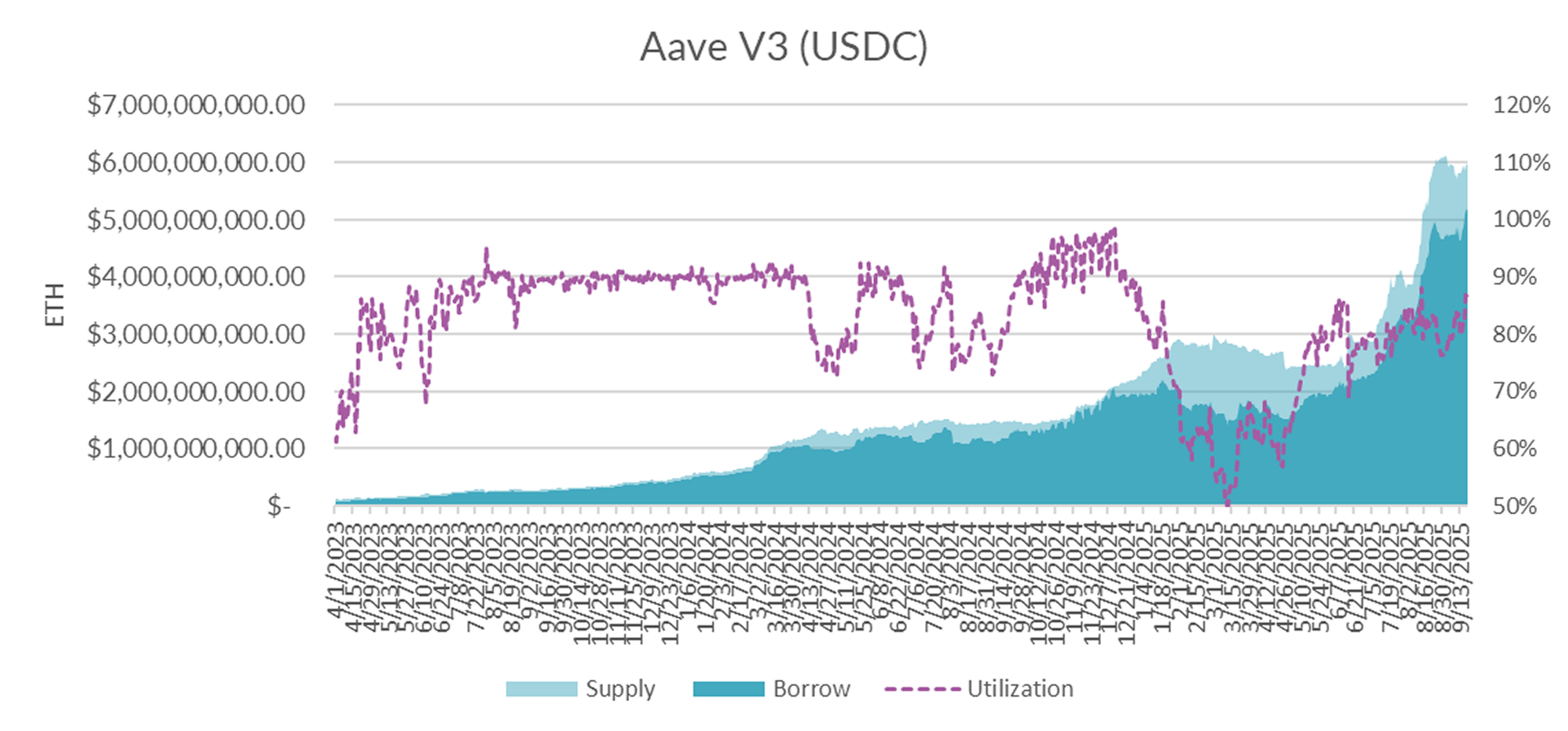 Diving into the microstructure of Aave's USDC markets, USDC supply rose +148M while borrows declined just +310M over the same period, taking utilization into the high 80s, and close to the interest rate kink.
