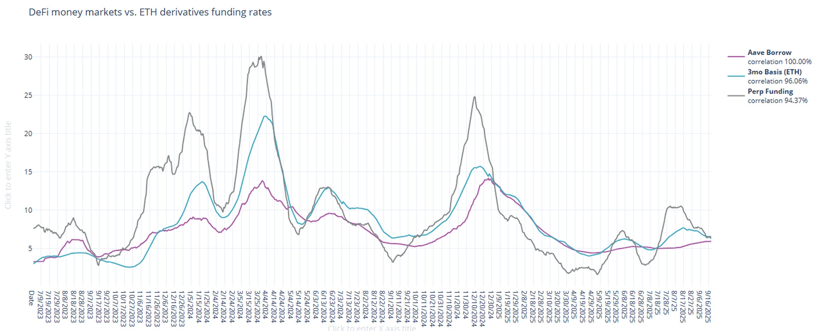 With derivatives funding rates on the decline, the ratio between DeFi and derivatives funding continues to normalize back towards parity.