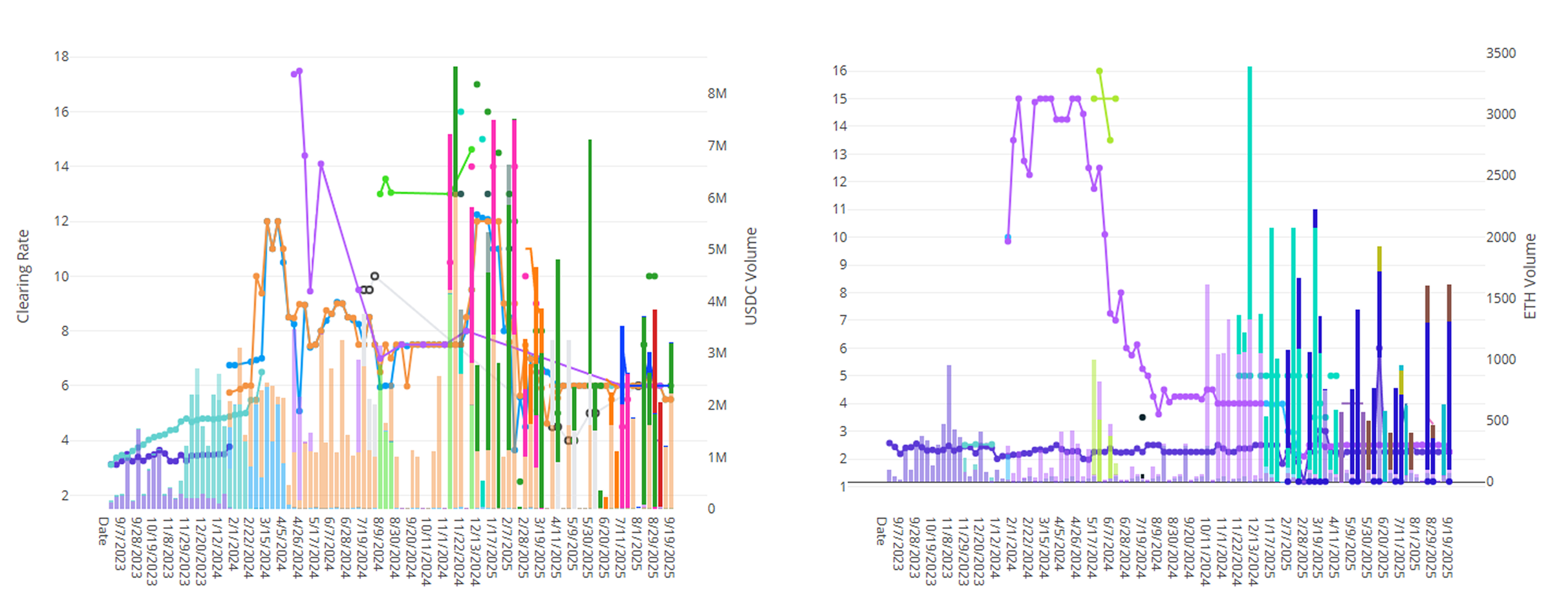 Term cleared ~4M in stablecoin loans and over 1500 ETH this week. On the stablecoin side, Term cleared the first fixed-rate loan backed by FalconX’s RWA credit strategy. On the ETH side, a sizeable chunk of ETH+ loans rolled at 3.50% offering strong risk-adjusted APRs in excess of the ETH staking rate.