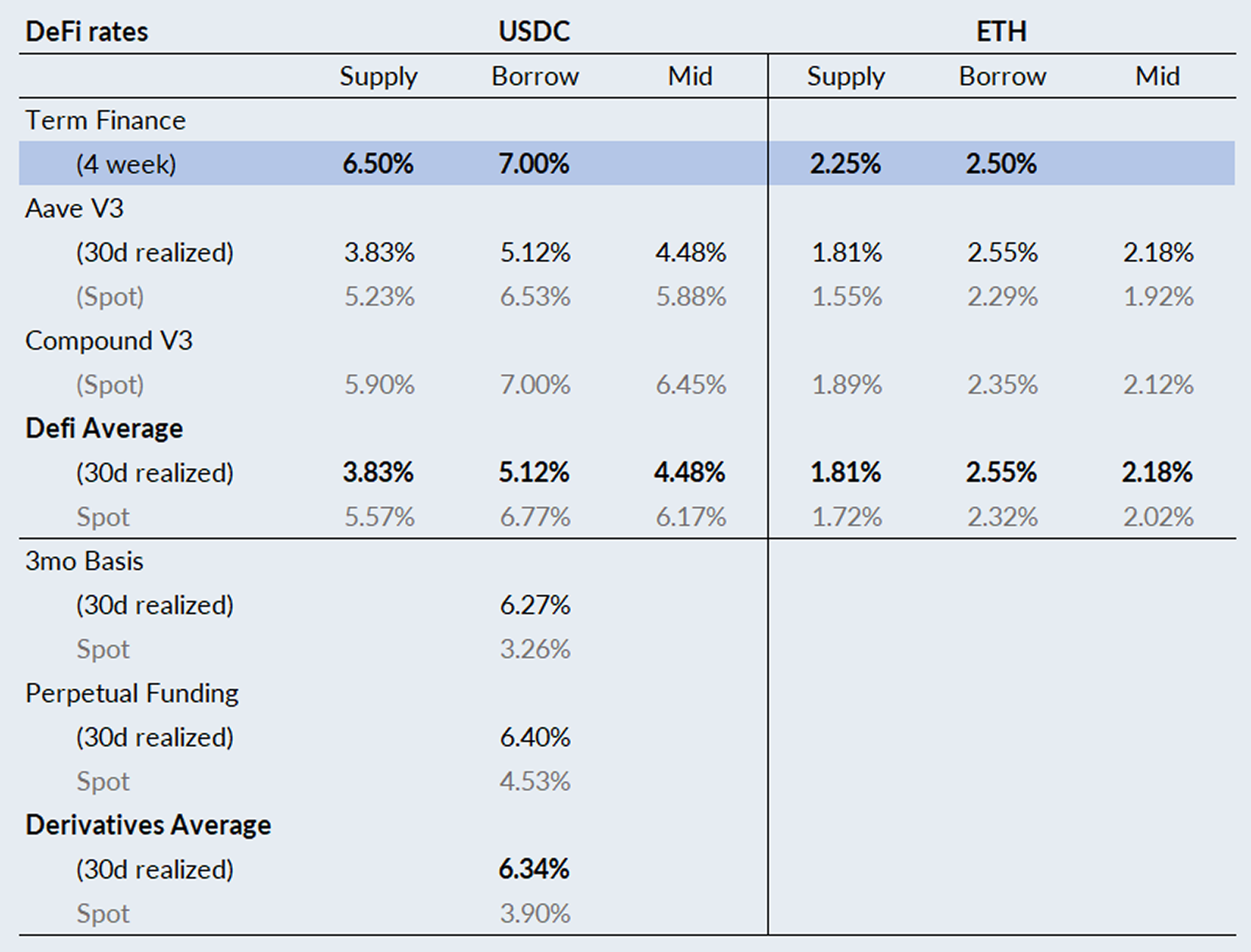 Turning to DeFi variable rate markets, the 30-day trailing average rose +2bps to 5.91% on a 30-day trailing basis. On a shorter lookback period, USDC borrow rates averaged 6.08% suggesting further gains ahead.