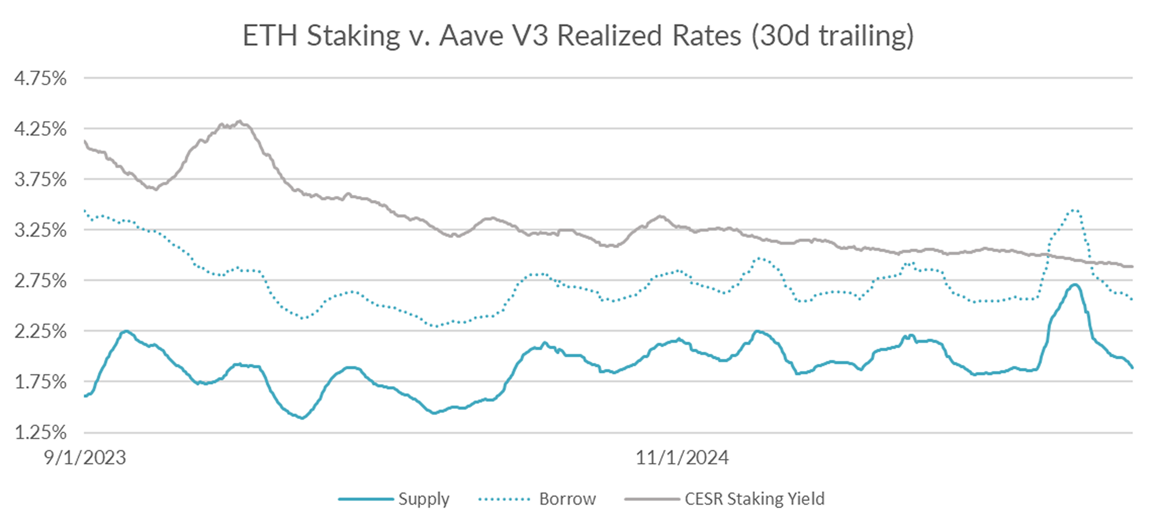 Turning now to ETH markets, ETH rates fell -8bps to 2.55% on a 30-day trailing basis over the past week. The CESR staking index, closed down a more subdued -1bp on the week at 2.88%, widening the spread by a slight margin.