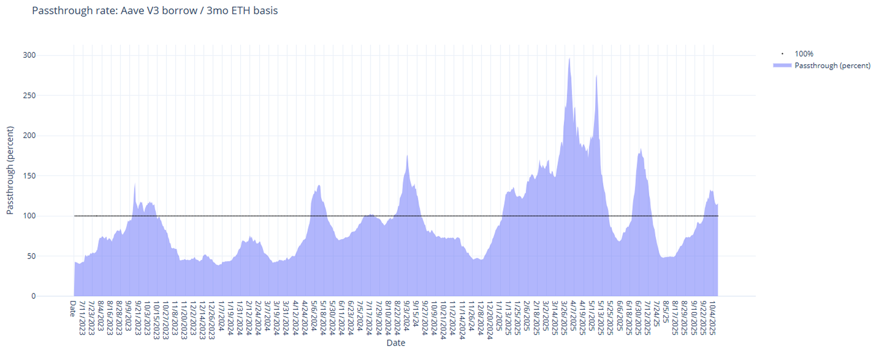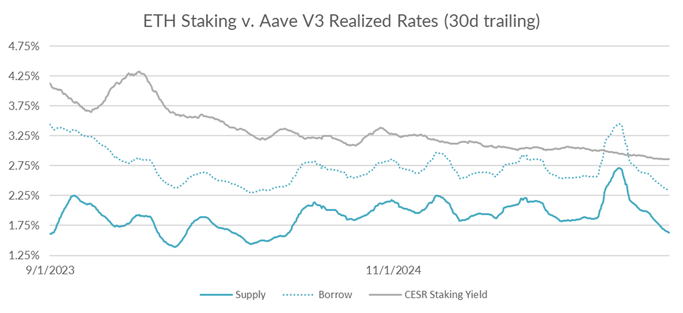 With the spread between staking and Aave borrow rates creeping back up to 50bp for the first time since June, expect a floor to set in keep Aave rates bid in the near term around 2.3%.