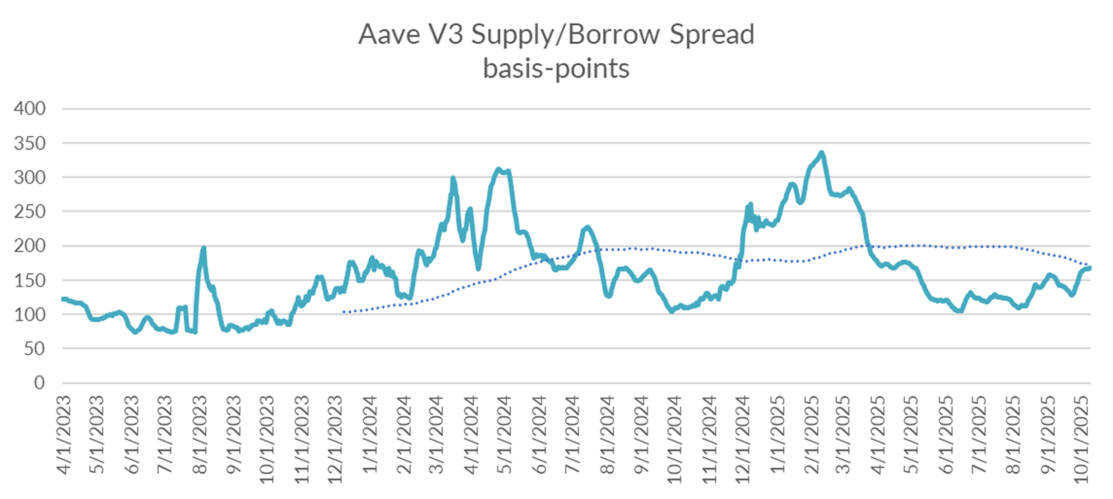 Despite this increase in borrows, overall utilization is down month-over-month causing borrow/lend spreads to creep up in recent days.