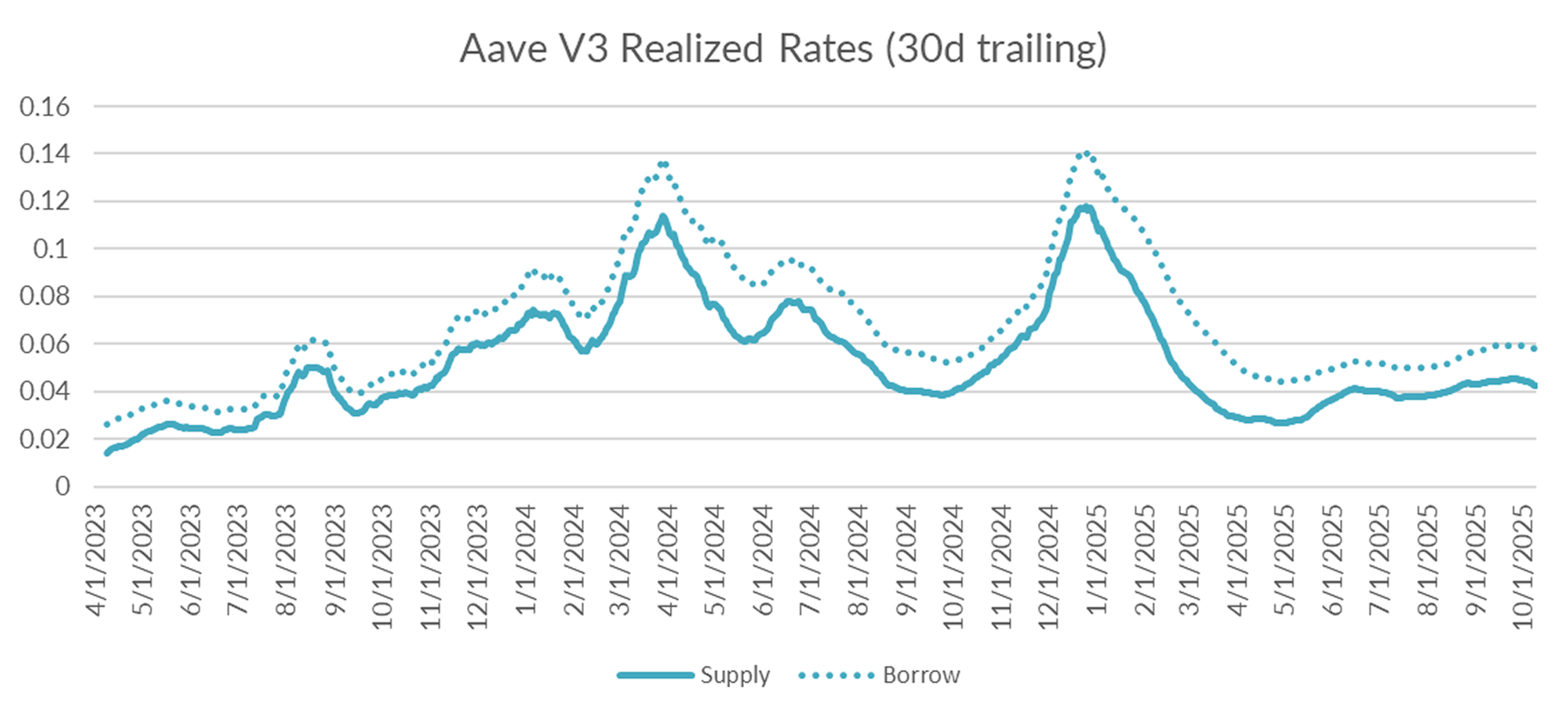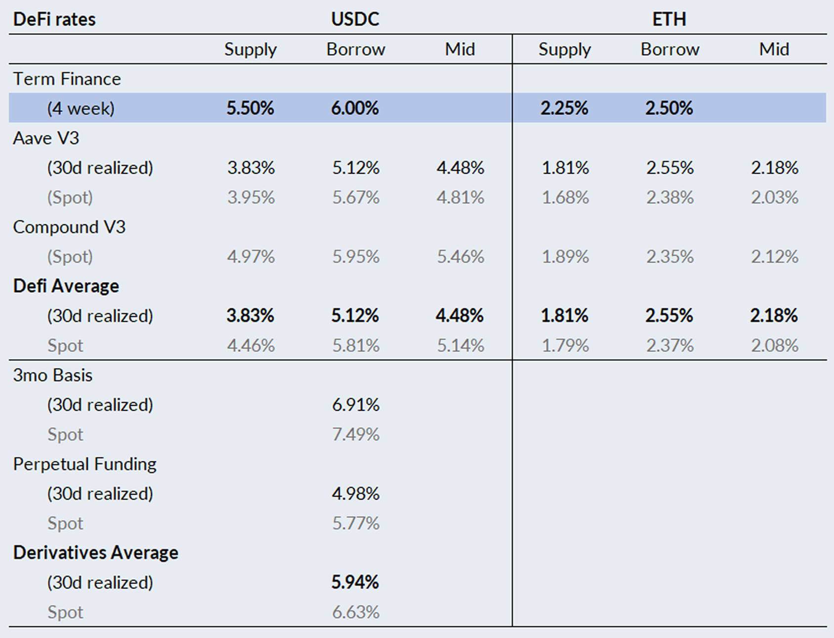 Turning to DeFi variable rate markets, the 30-day trailing average fell -14bps to 5.76% on a 30-day trailing basis. On a shorter lookback period, USDC borrow rates averaged just 5.42% suggesting further declines ahead.