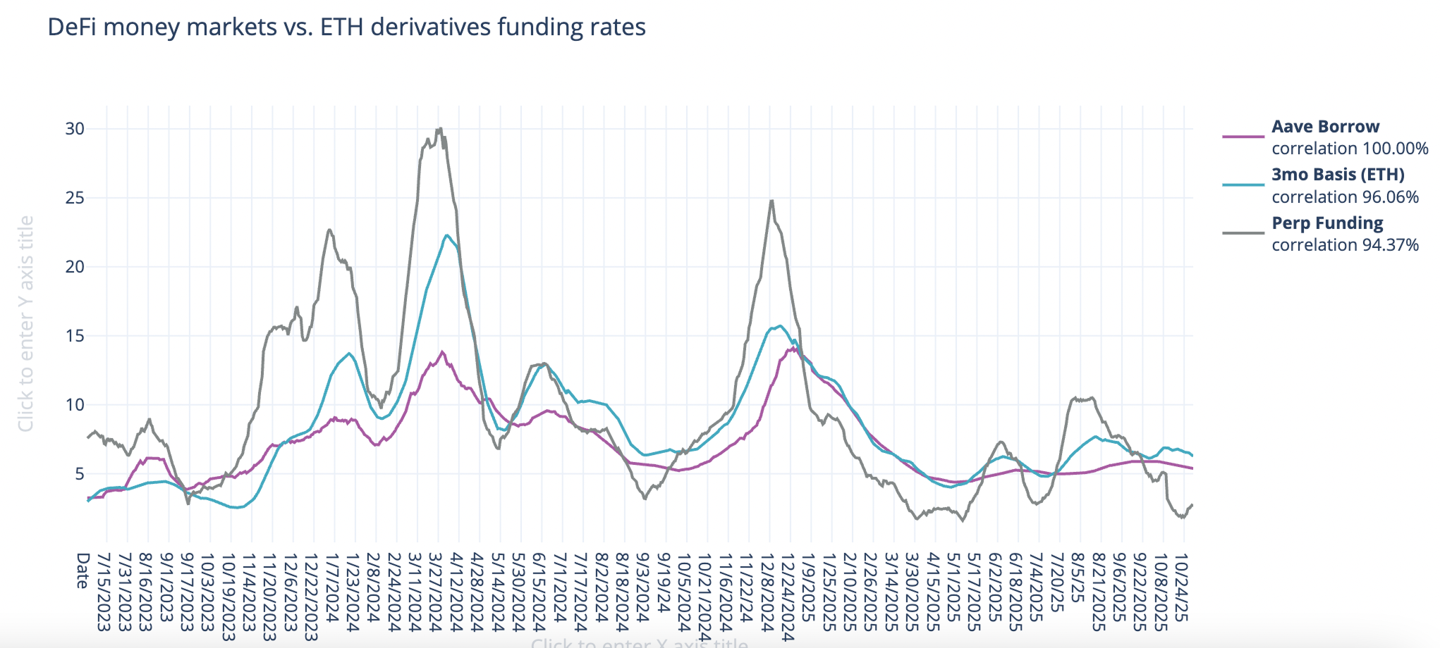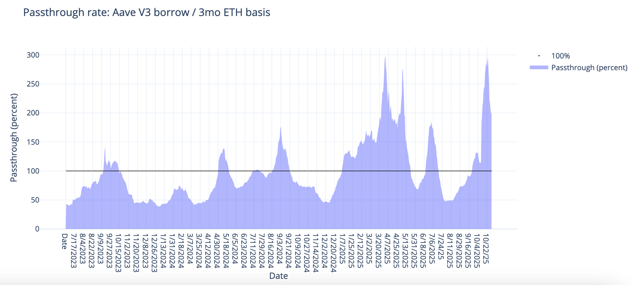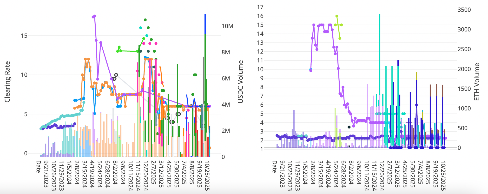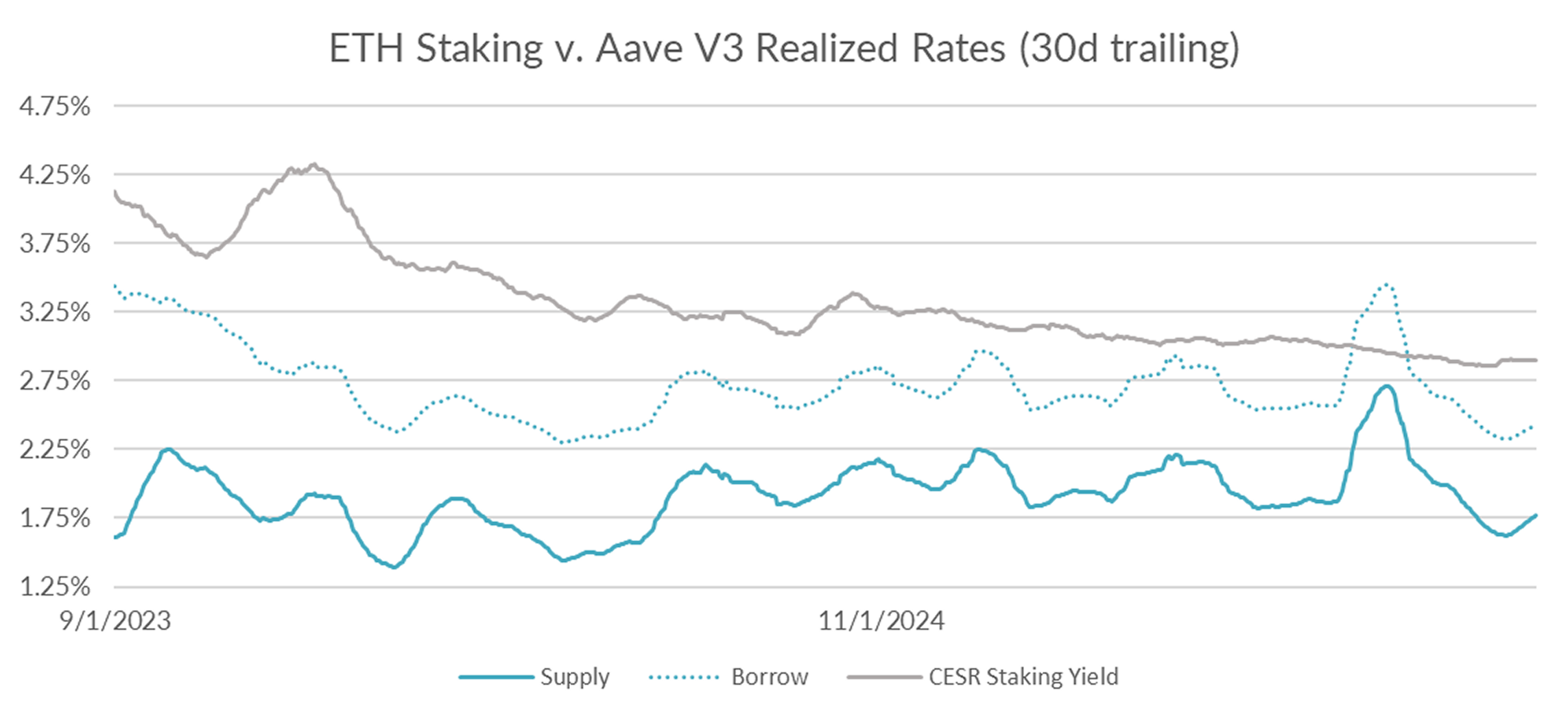 Turning now to ETH markets, ETH rates rose +4bps to 2.42% on a 30-day trailing basis over the past week. The CESR staking index, on the other hand, closed flat on the week at 2.90%, narrowing the spread to around -x\4bp.