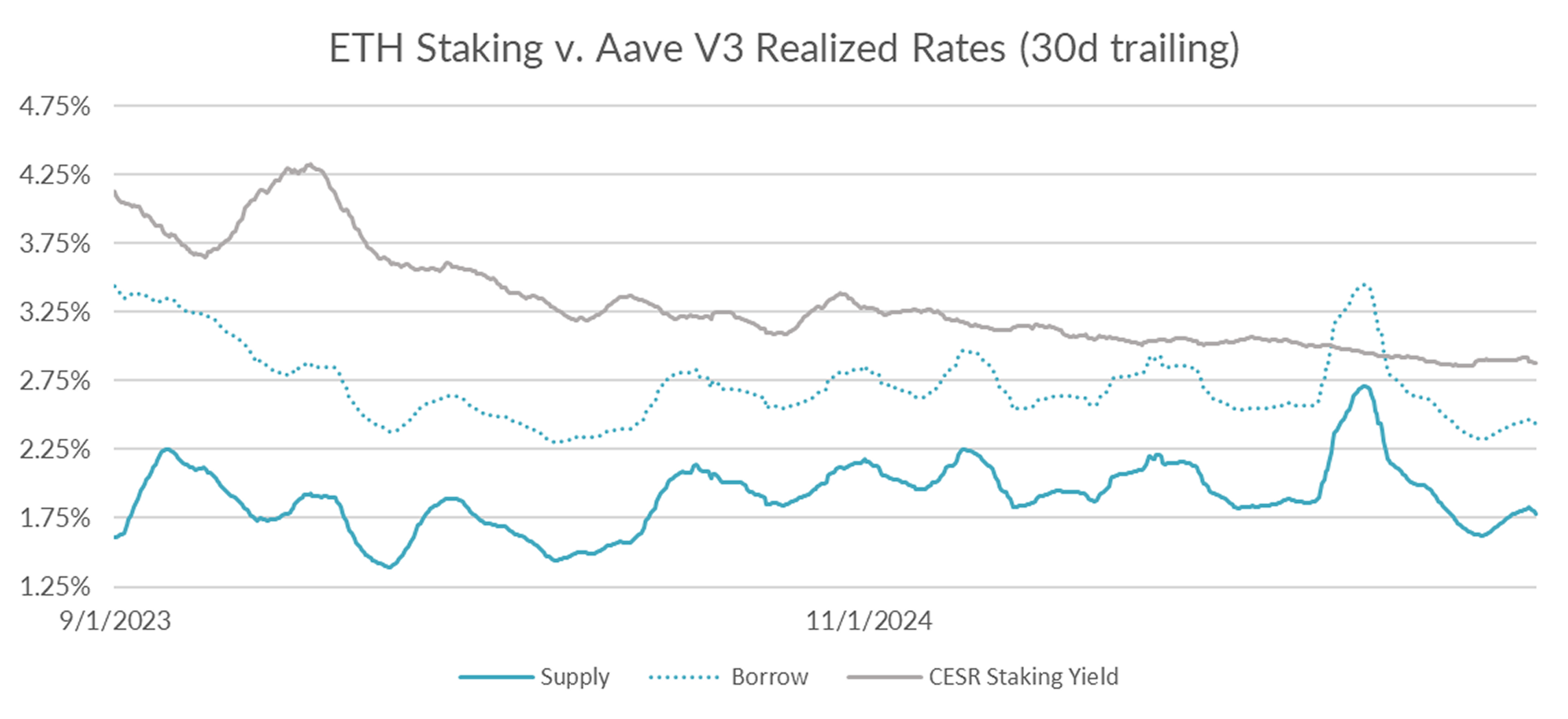 Turning now to ETH markets, ETH rates fell -2bps to 2.43% on a 30-day trailing basis over the past week. Likewise, the CESR staking index fell -3bps on the week to close at 2.88% consistent with DeFi lending markets.
