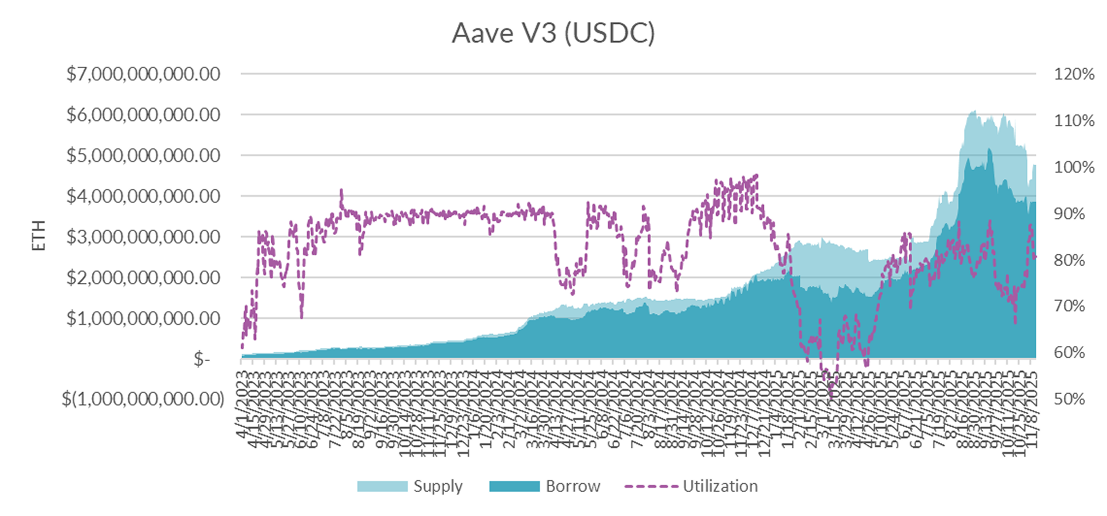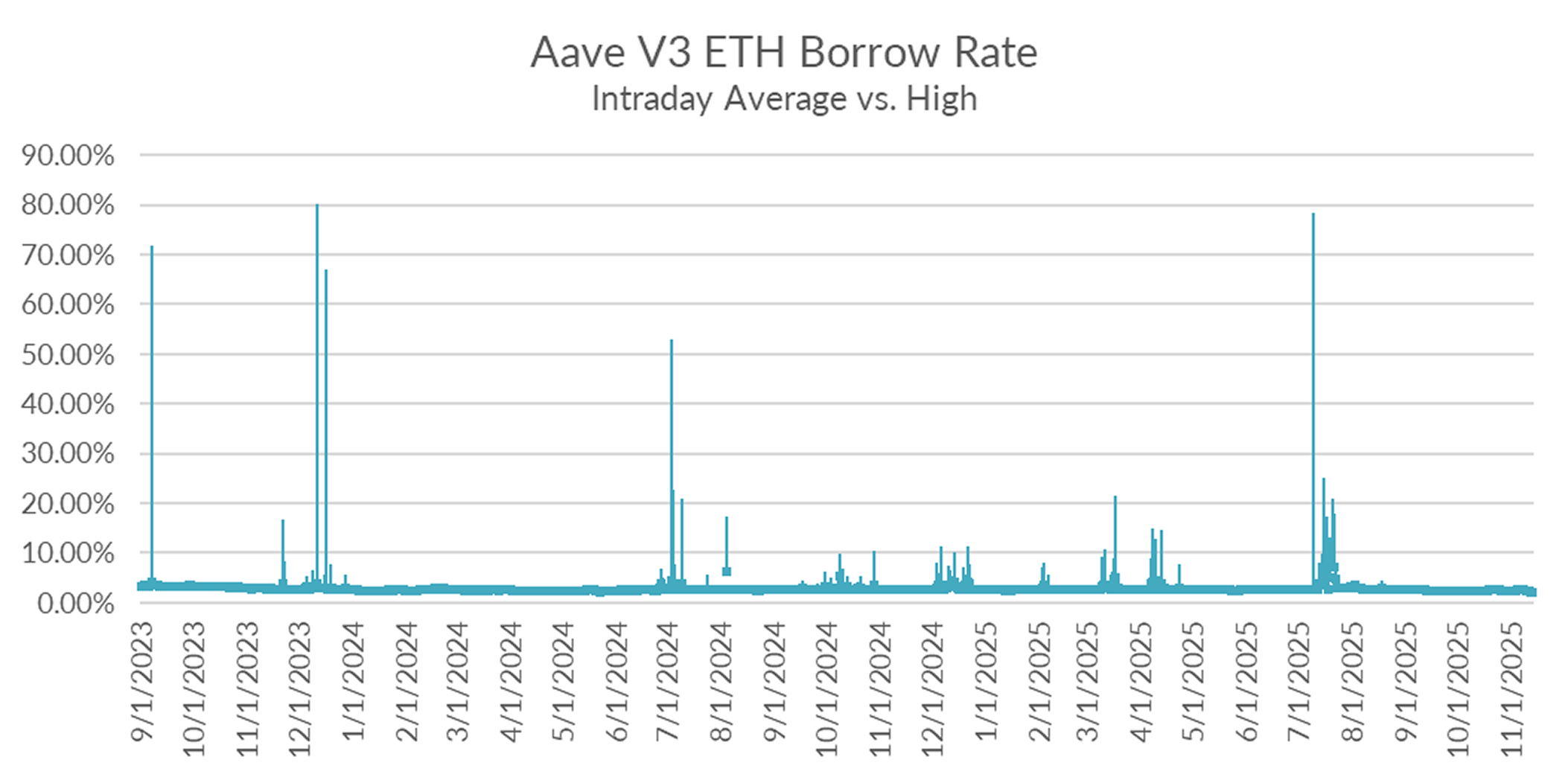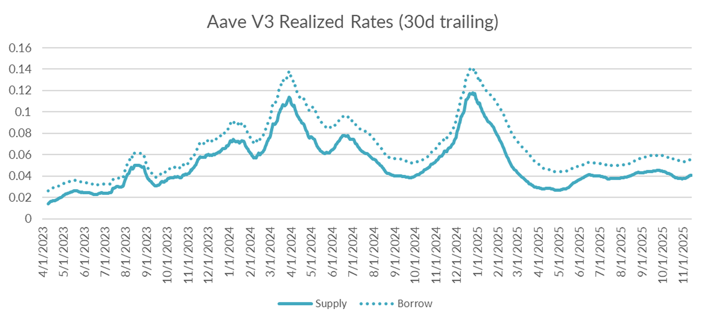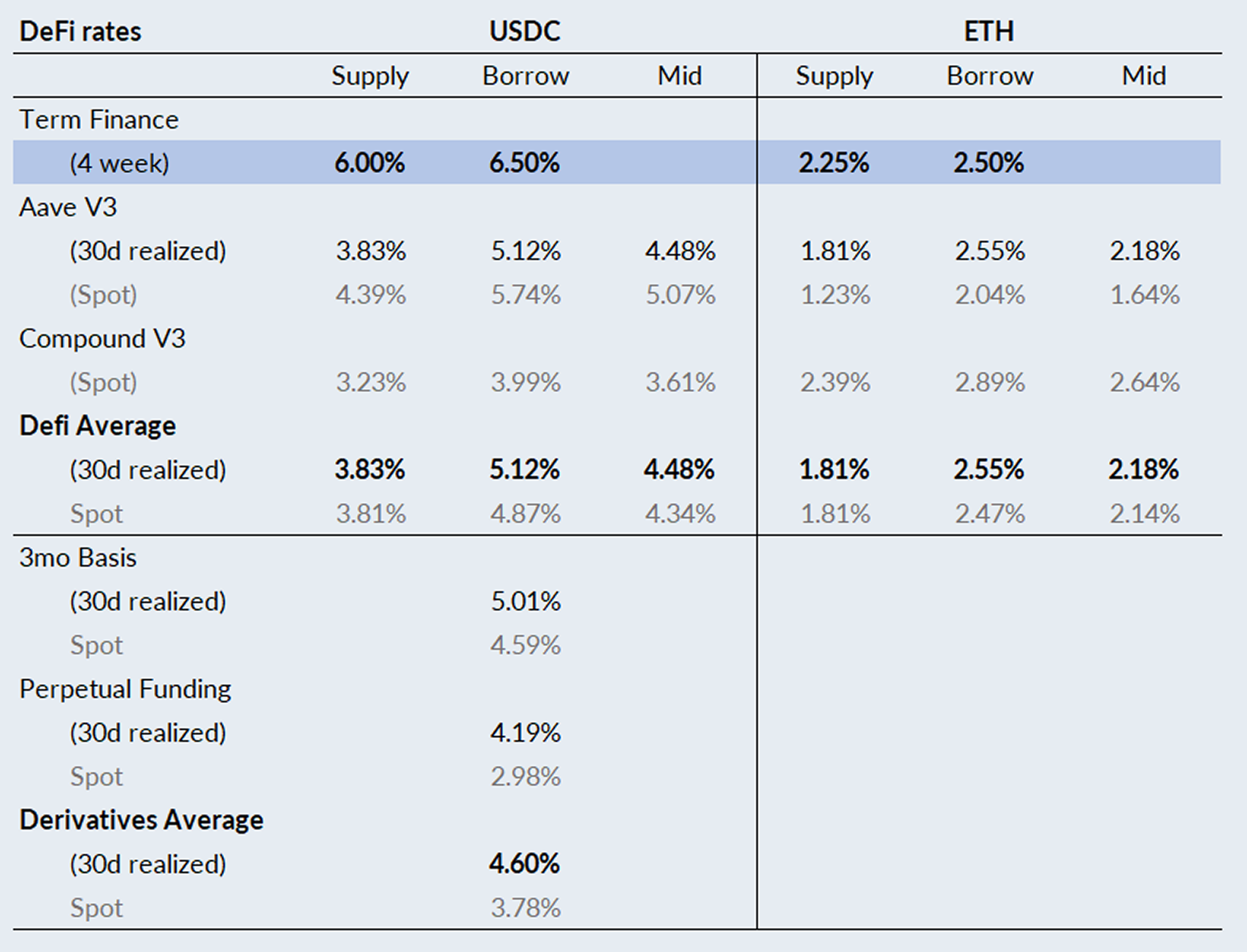 Turning to DeFi variable rate markets, the 30-day trailing average continued to rise by +11bps to 5.53% on a 30-day trailing basis. On a shorter lookback, USDC borrow rates averaged 6.05%, reflecting some residual pressure from last week’s liquidity crunch early in the week.